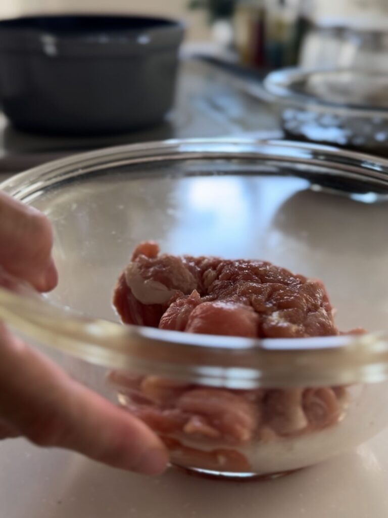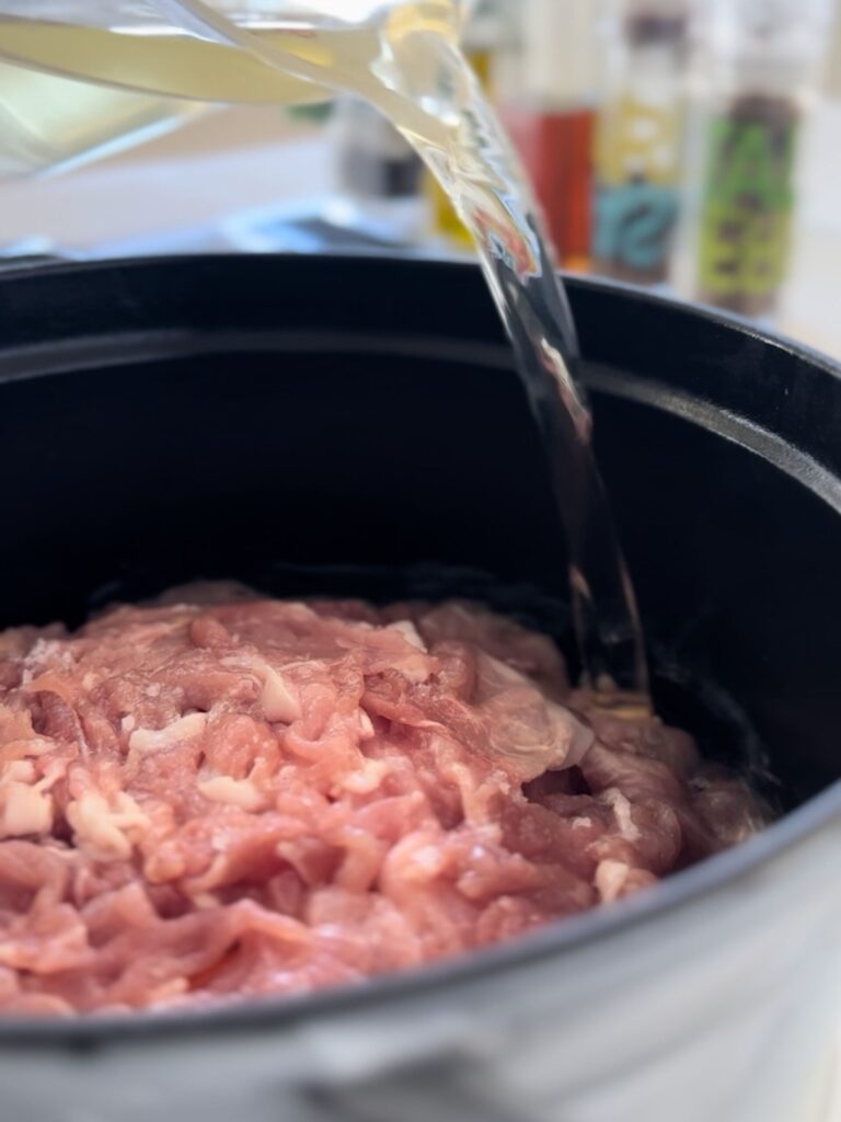 1.豚こま切れ肉は一口大に切り、酒・しょうゆをもみ込む。しらたきはさっと下茹でして食べやすい長さに切る。刻み昆布は水で戻してざく切りにする(戻し汁はとっておく)。にんじんは細切りにする。