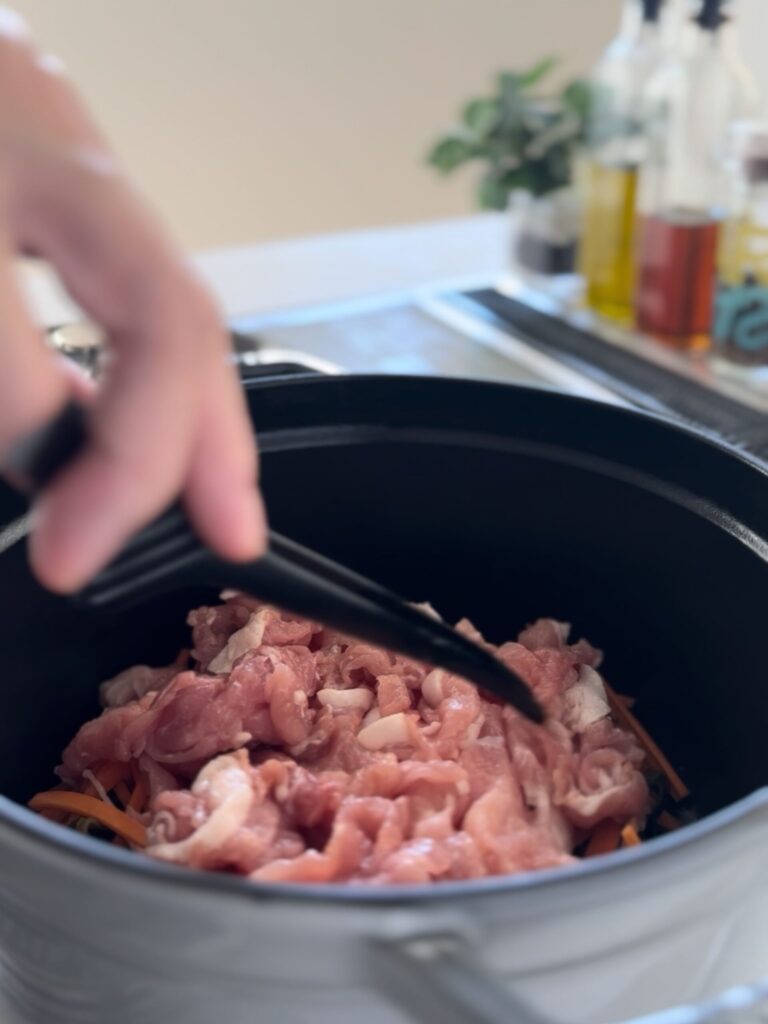 2.フライパンまたは鍋に、塩(ひとつまみ)→しらたき→刻み昆布→にんじん→豚こま切れ肉→塩(ひとつまみ)の順に重ねる。