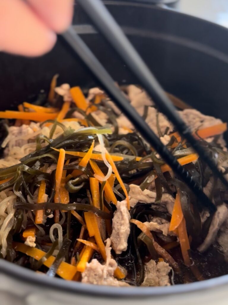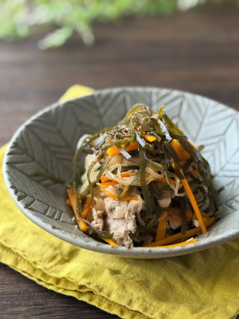 ミネラル豊富な刻み昆布と豚肉の旨みがじんわり広がり、どこか懐かしくてほっとする味わいのおかずです。