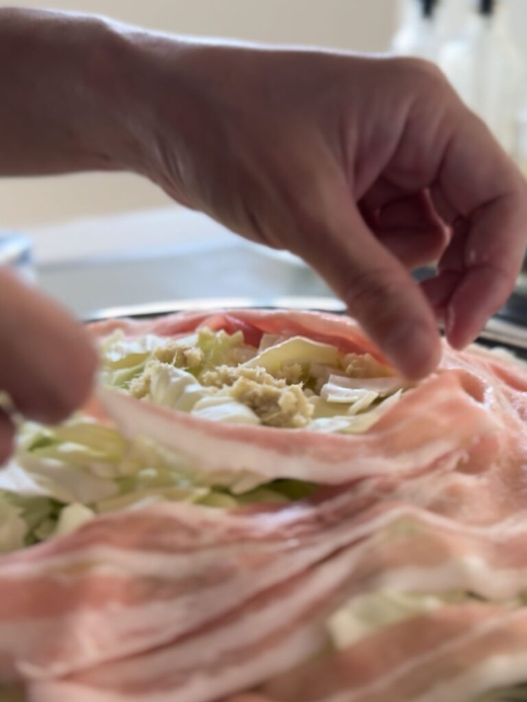 2.フライパンに、塩(ひとつまみ)→もやし→春雨→キャベツ→しょうが・にんにく→豚バラ薄切り肉の順に重ねる。