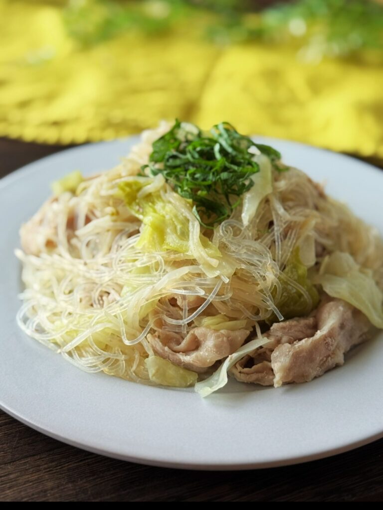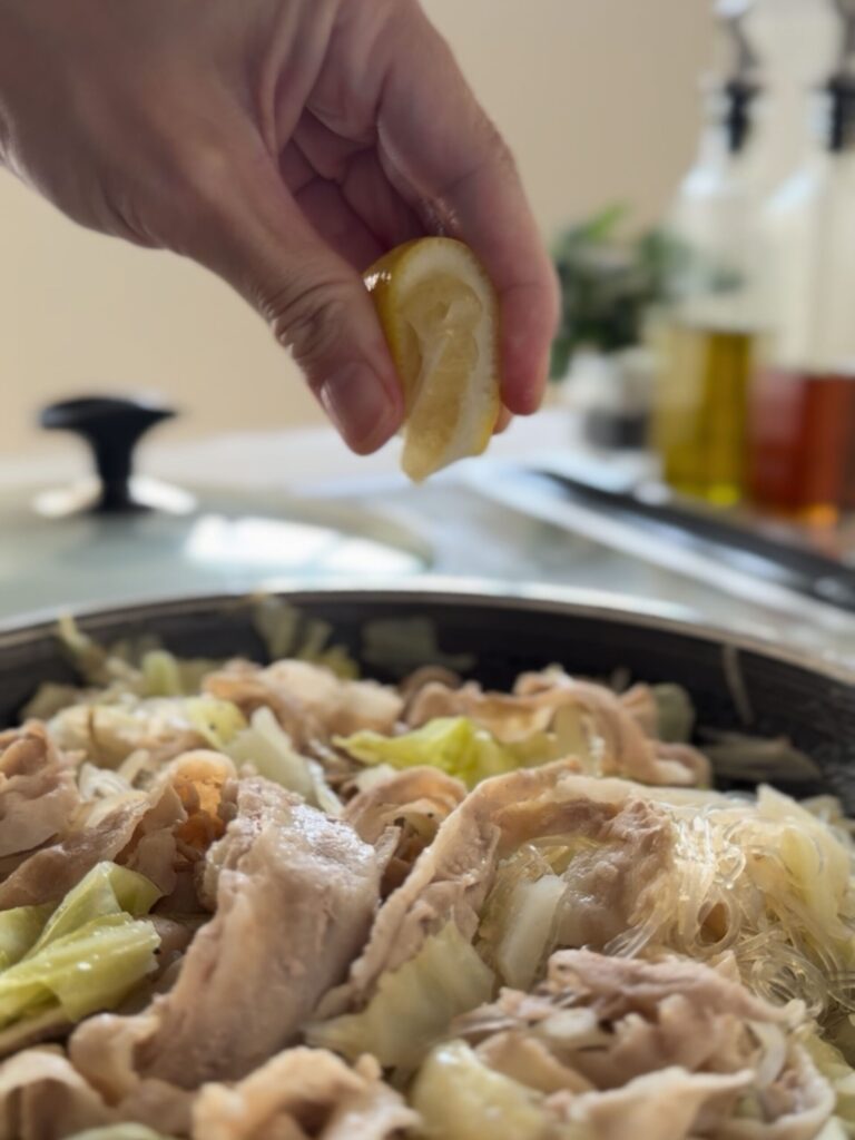 豚のうまみをキャベツや春雨がたっぷり吸って、レモンをしぼればさっぱり爽やか。暑い日にも食欲がすすむ一品です。