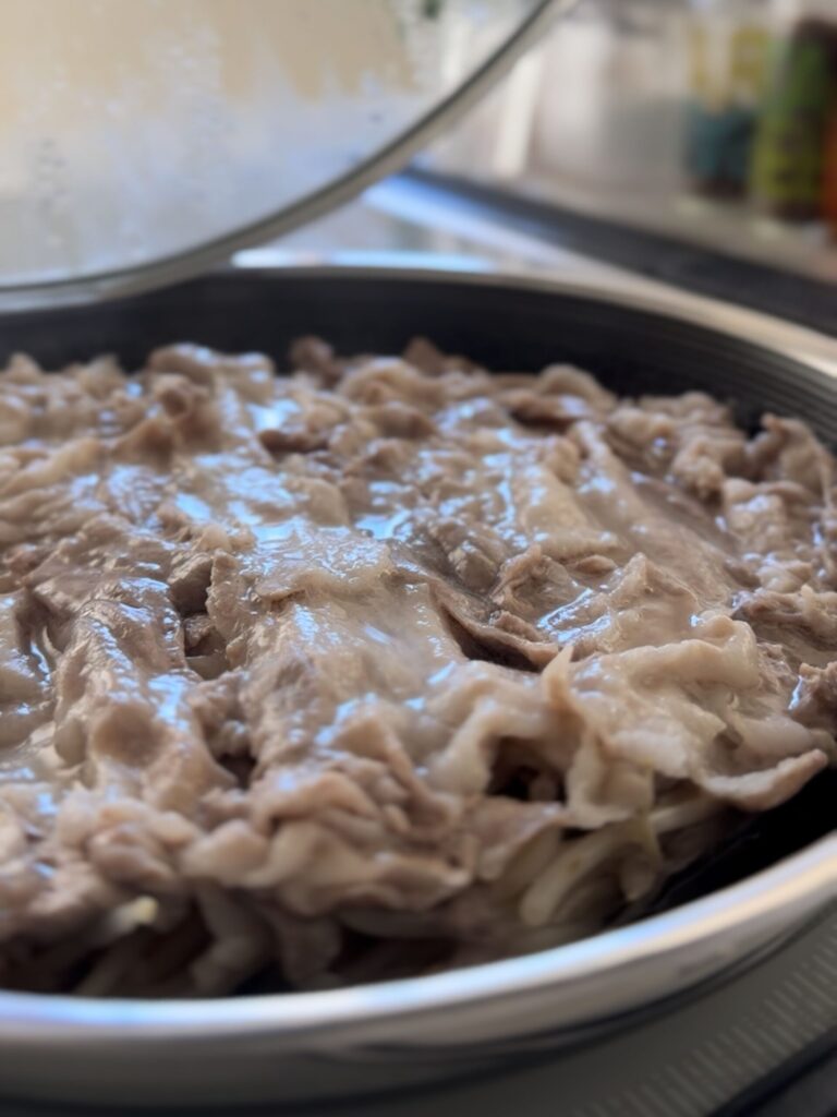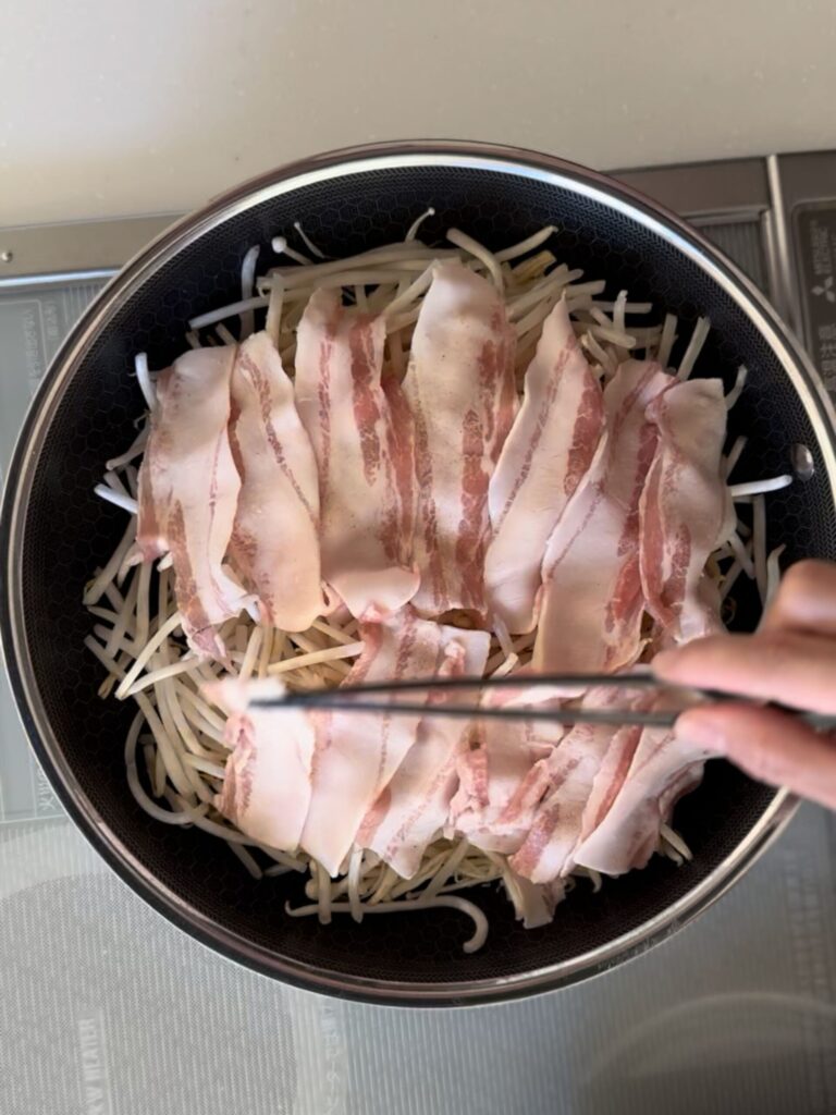 2.フライパンに塩(ひとつまみ)→えのき→もやし→豚バラ薄切り肉の順に重ねる。