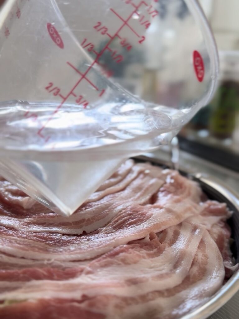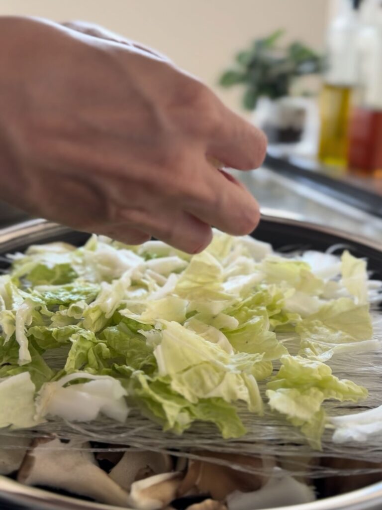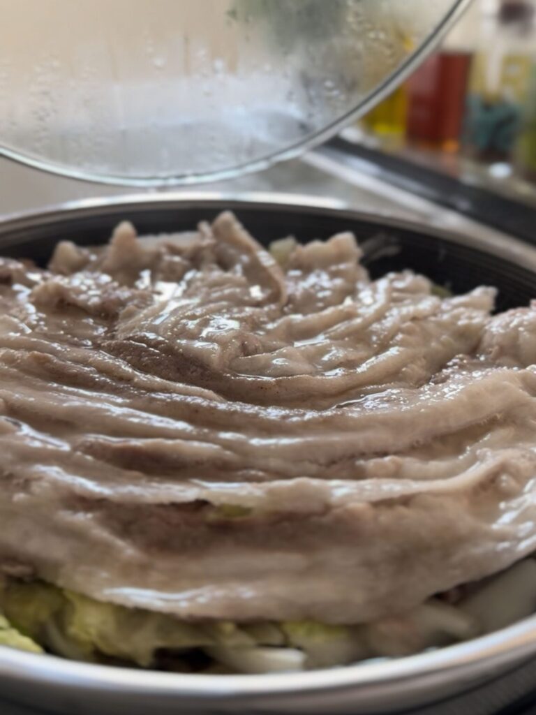 2.フライパンに、塩(ひとつまみ)→まいたけ→緑豆春雨(乾)→白菜→しょうが・にんにく→豚バラ薄切り肉の順に重ねる。