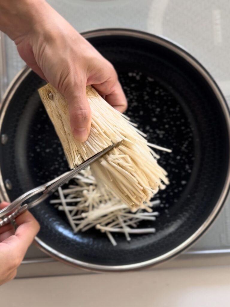 1.豚バラ薄切り肉は食べやすい大きさに切り、軽く塩こしょうをふる。えのきは石づきを落としてほぐし、半分の長さに切る。小松菜は4cm幅に切る。しょうがとにんにくはすりおろす。春雨は乾燥のまま使用する。