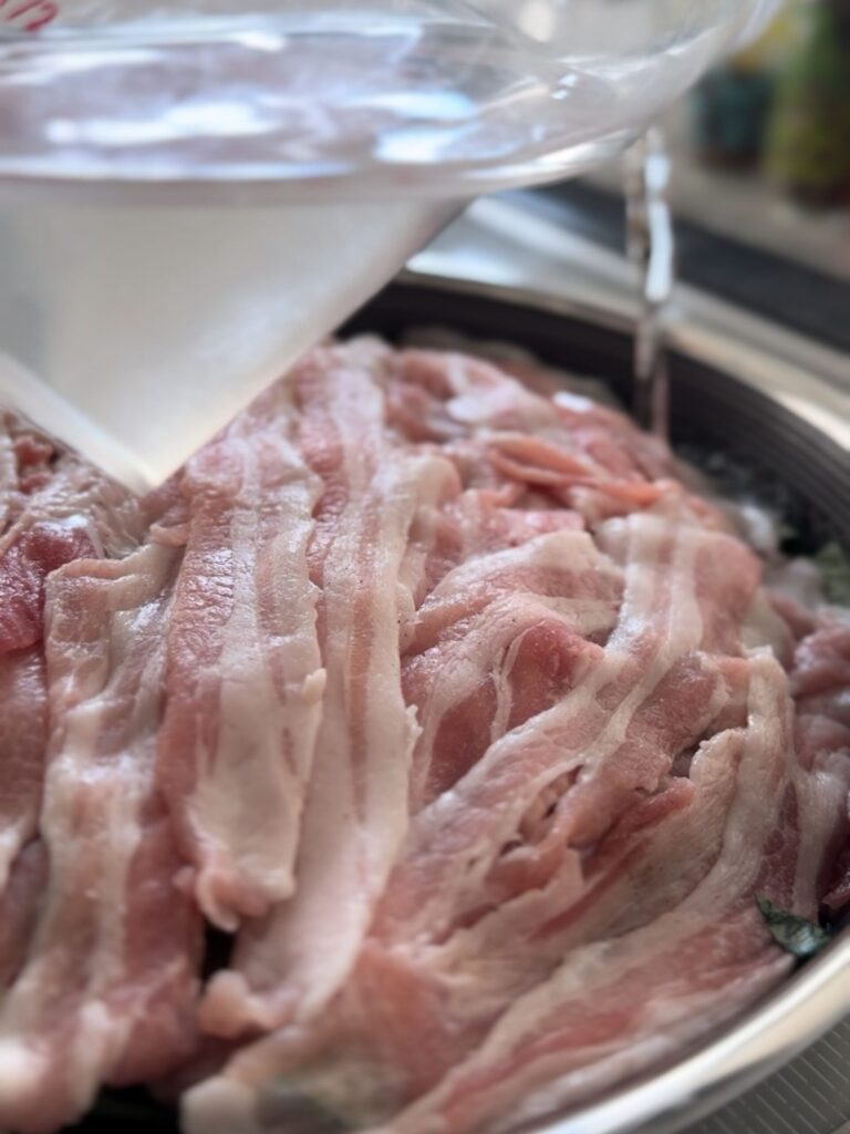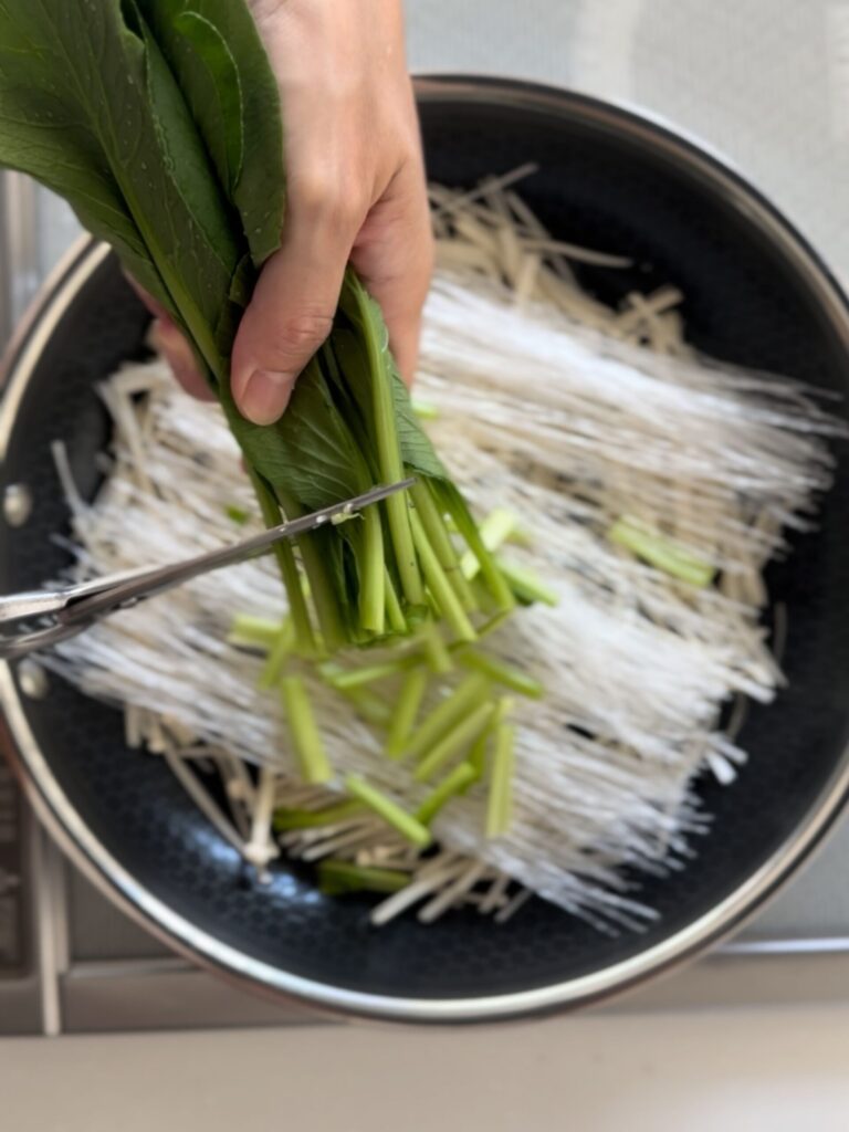 2.フライパンに塩ひとつまみをふり、えのき→緑豆春雨→小松菜→しょうが・にんにく→豚バラ肉の順に重ねる。