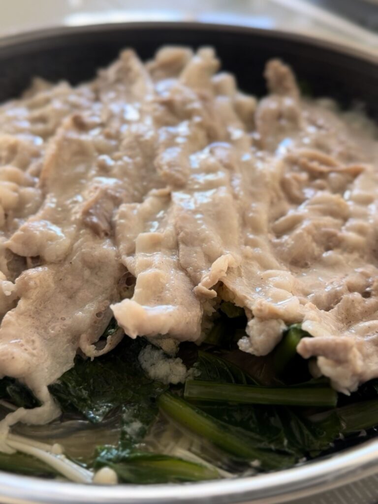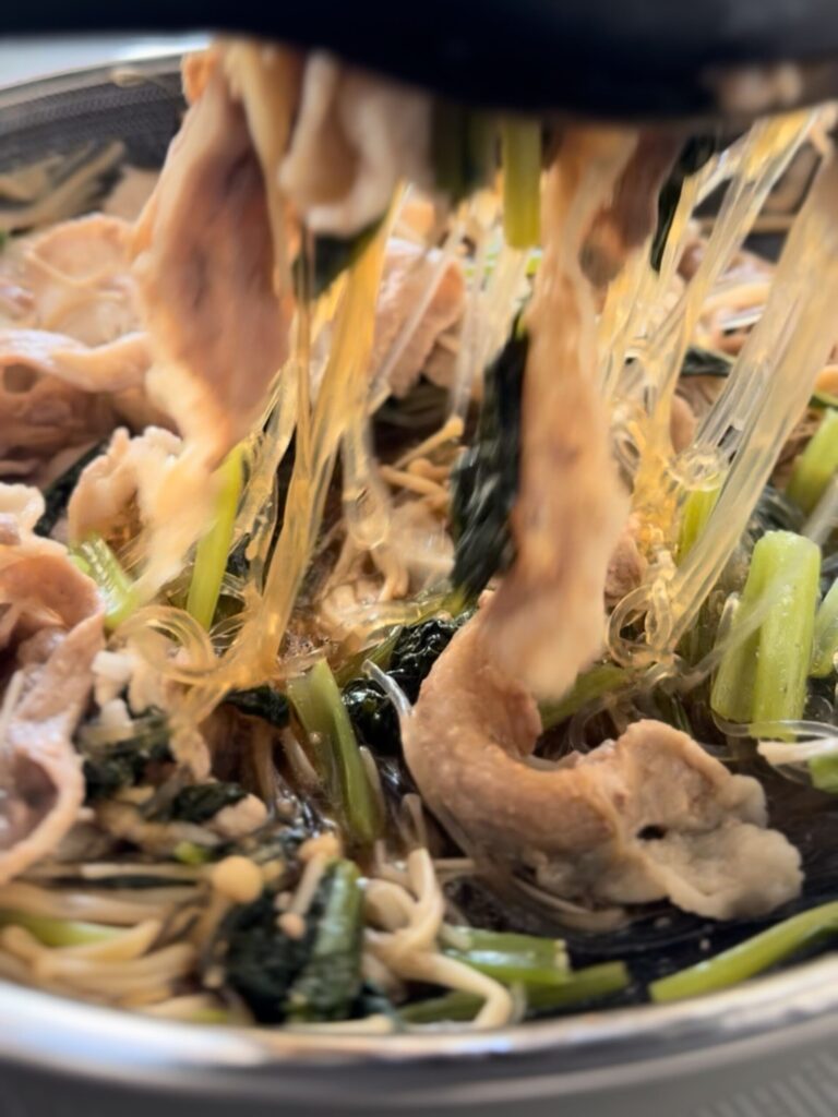 重ねて5分蒸すだけで、豚肉や小松菜、えのきの旨みが春雨にしっかり染み込みます。