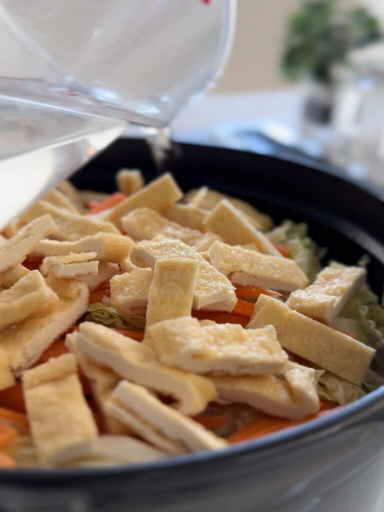 2.鍋に塩(ひとつまみ)→えのき→しょうが→白菜→にんじん→油揚げ→塩(ひとつまみ)の順に重ねる。