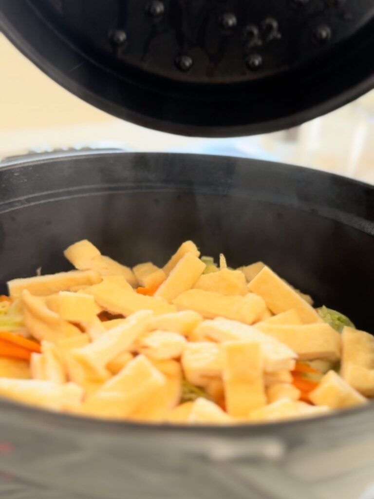 重ね煮で作る白菜と油揚げのとろみ煮は、野菜の甘みがしっかり感じられるやさしいひと皿。最小限の水で煮ることで旨みが凝縮し、短時間でも深い味わいに仕上がります。