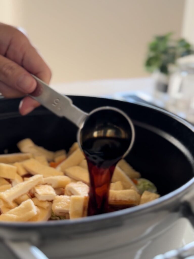 重ねて加熱するだけで、野菜から自然に水分が出て旨みが重なり、やさしい味わいに仕上がる白菜と油揚げのとろみ煮。