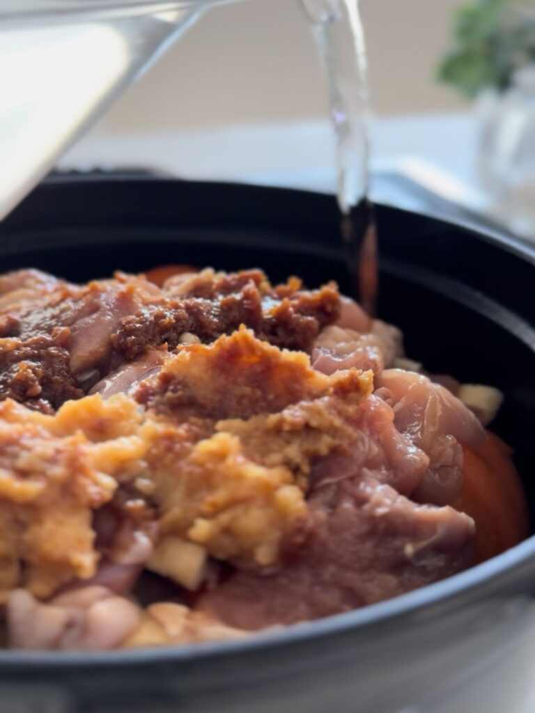 3.鍋肌からひたひたになるまで水を回しかけ(600mlほど)、ふたをして中火にかける。沸騰したら弱火にして10分煮る。