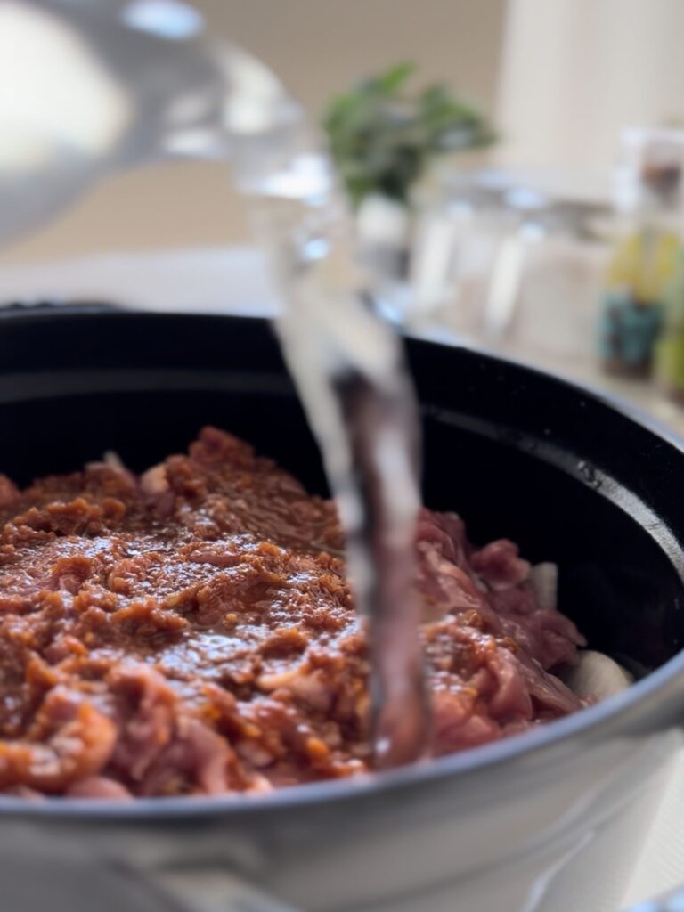 3.鍋肌からひたひたになるまで水を回しかけ(500mlほど)、ふたをして中火にかける。沸騰したら弱火にして10分煮る。
