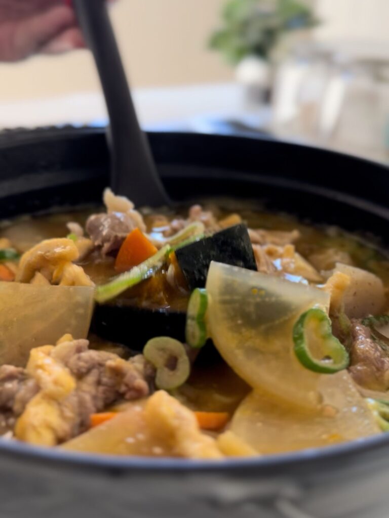 「かぼちゃ入り具だくさん豚汁」は、重ね煮だからこそ出汁なしでも野菜の甘みと旨みがしっかり味わえる一品。