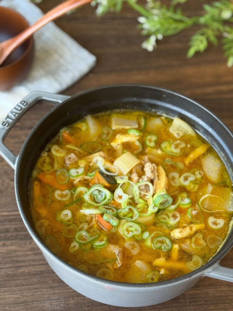 1.豚肉は一口大に切り、酒・しょうゆ・片栗粉をもみ込む。こんにゃくはスプーンでちぎる。長ねぎは白い部分を1cm幅に切り、青い部分を薬味用に小口切りにする。かぼちゃは皮つきのまま2cm角に切る。大根は皮つきのままいちょう切り、にんじんは皮つきのまま半月切りにする。油揚げは細切りにする。