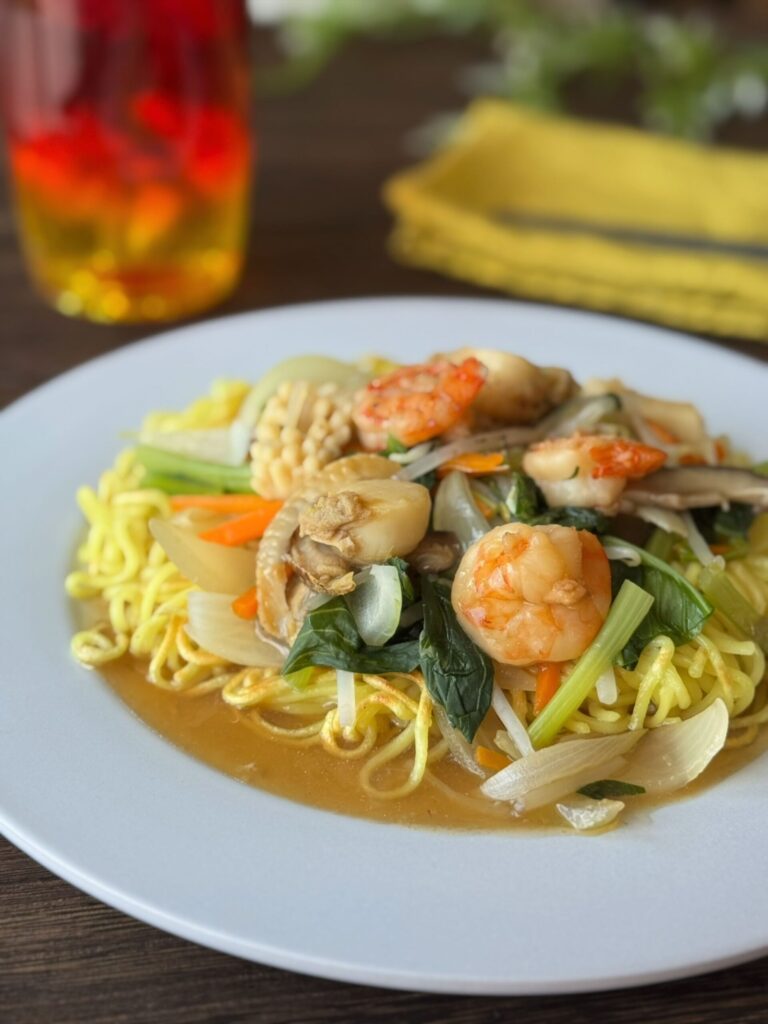 カリッと香ばしく焼いた中華麺に、とろりとした海鮮あんをたっぷりかけた一皿。