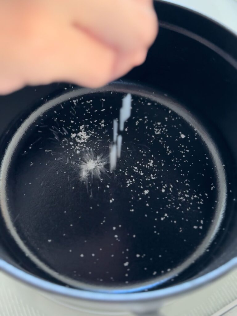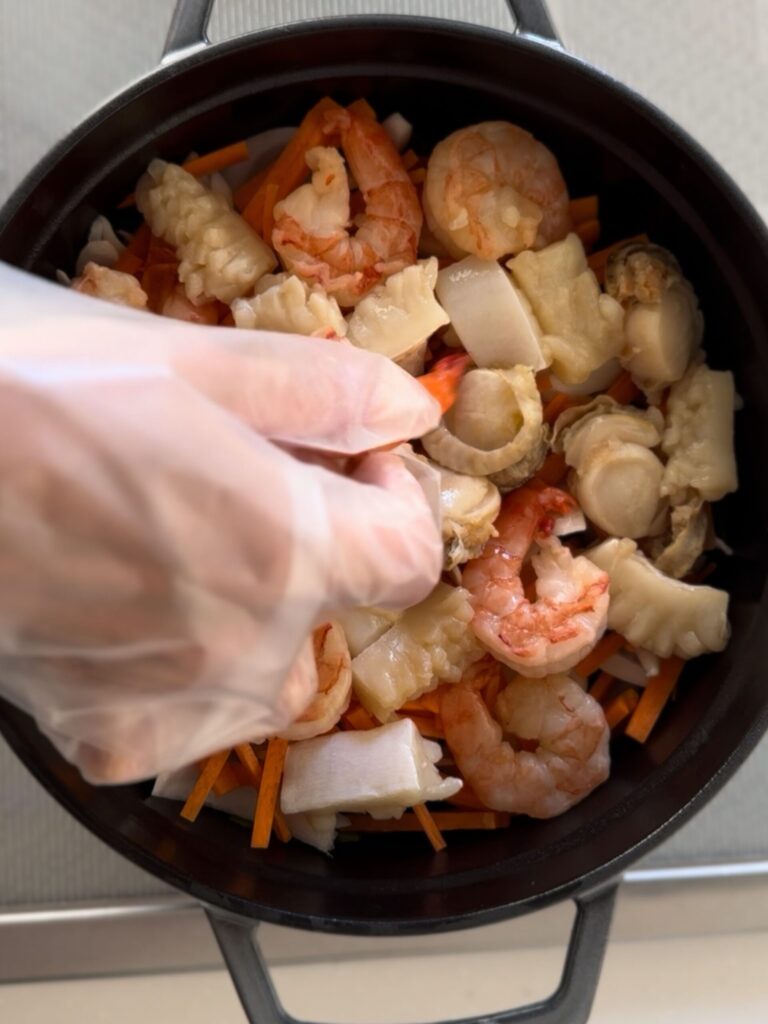 ②鍋に塩(ひとつまみ)→しいたけ→もやし→小松菜→玉ねぎ→にんじん→シーフードミックスの順に重ねる。