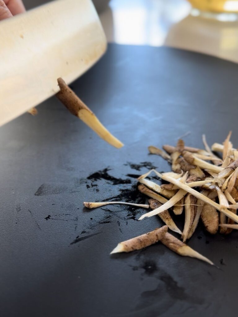 1.こんにゃくはスプーンでちぎる。干ししいたけは水に浸けて戻し、薄切りにする(戻し汁は取っておく)。長ねぎは斜め薄切り、大根はいちょう切り、にんじんは半月切り、ごぼうはささがきにする。豆腐は手で大きめにちぎる。