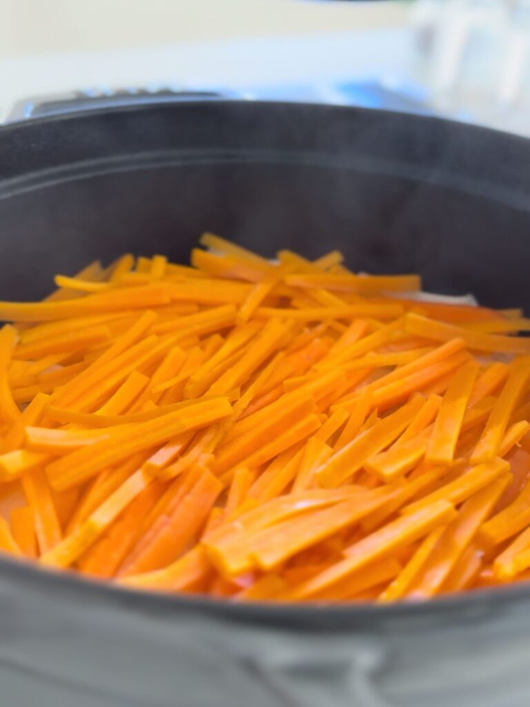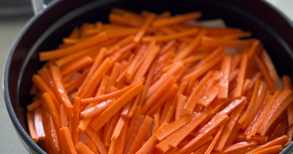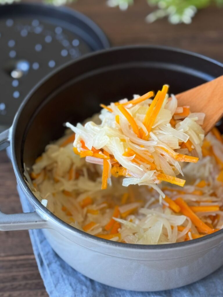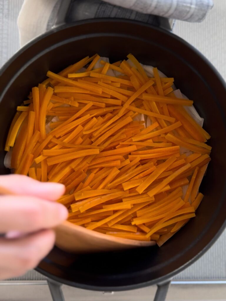 まずはベースとなる「基本の重ね煮」をご紹介します。今回はえのき・玉ねぎ・にんじんを使ったシンプルな組み合わせ。どんな料理にも合わせやすく、甘みも出やすいのが特徴です。