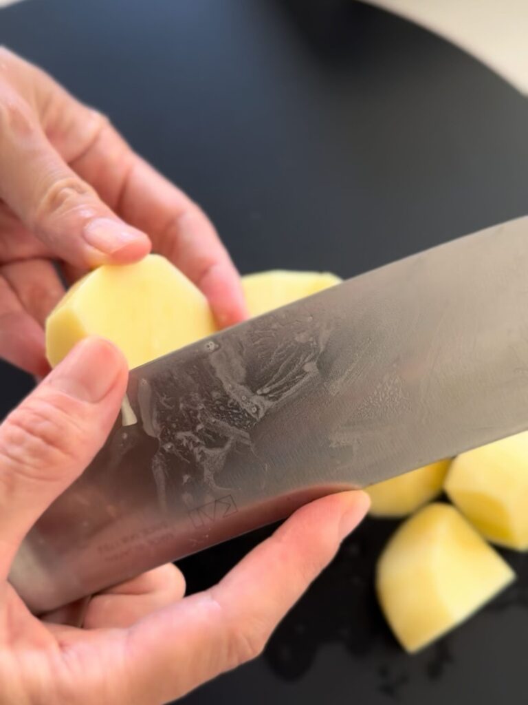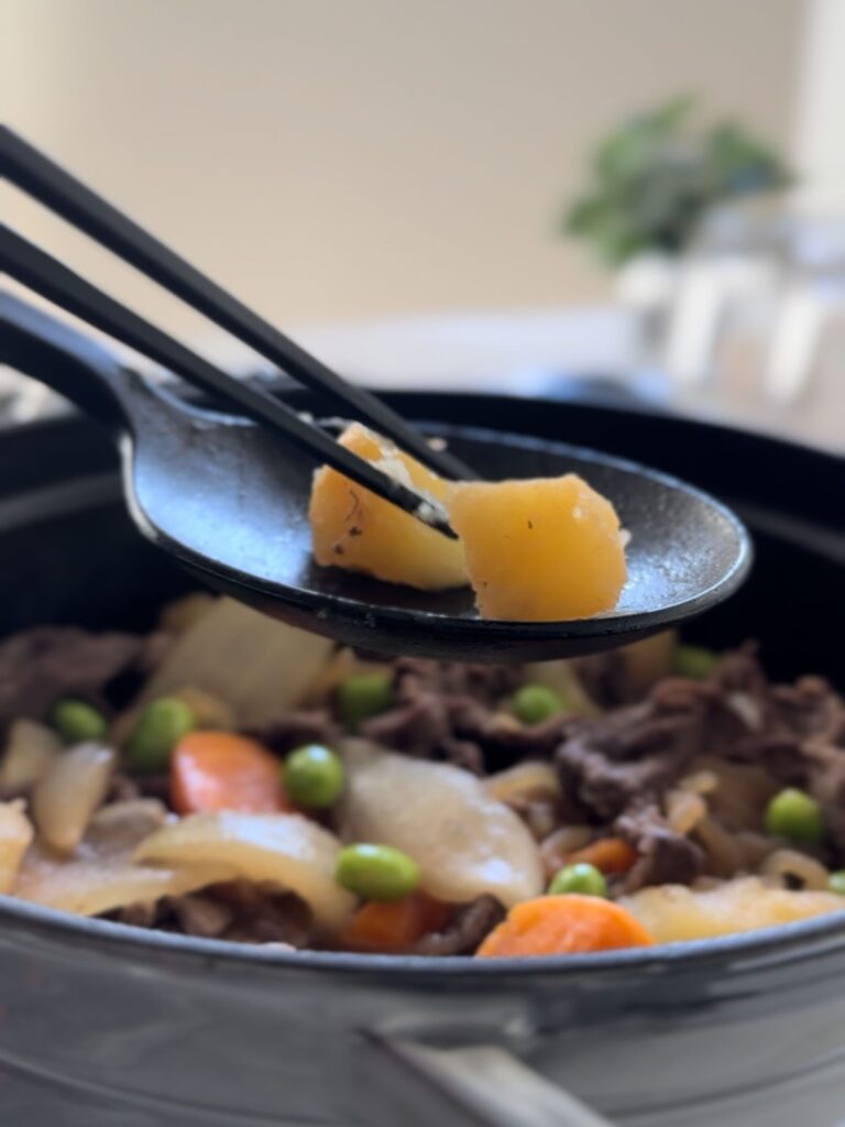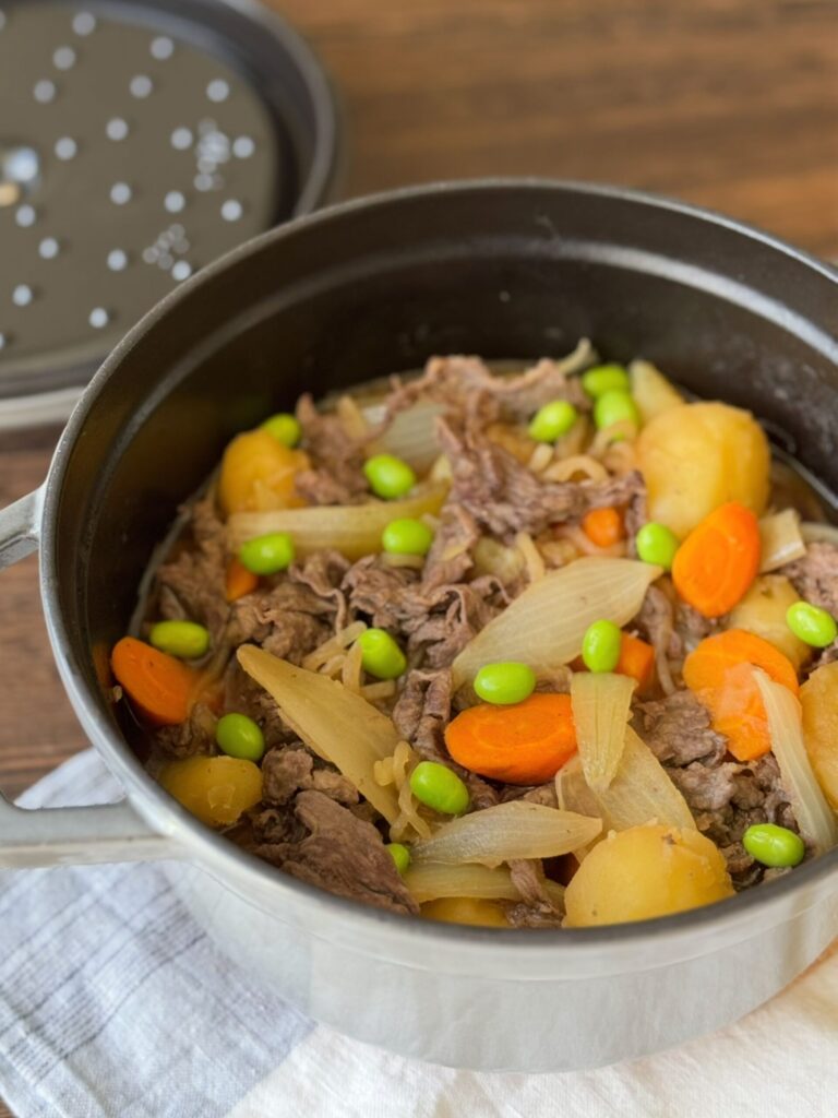 野菜の水分と調味料だけで煮込むから、旨みがぎゅっと濃縮された「無水肉じゃが」。