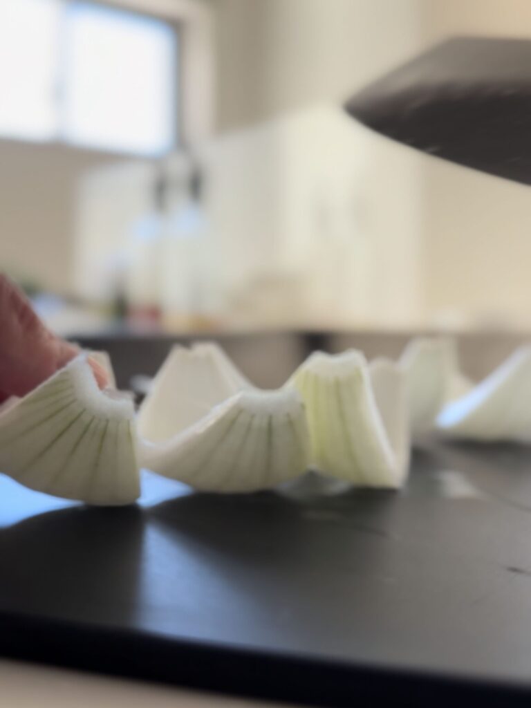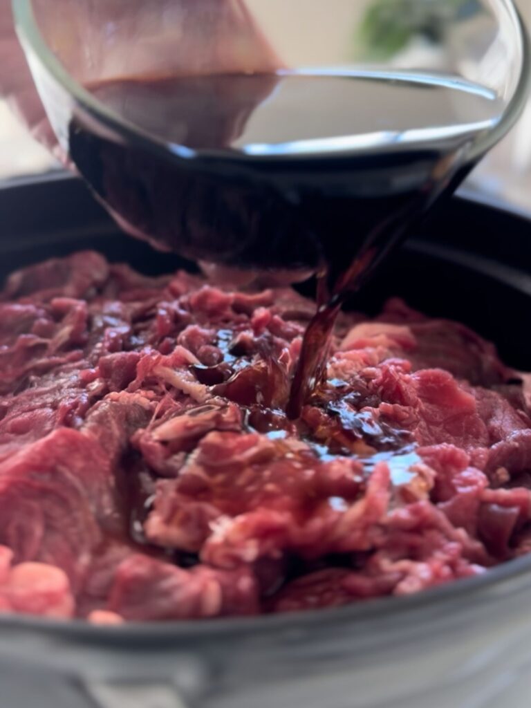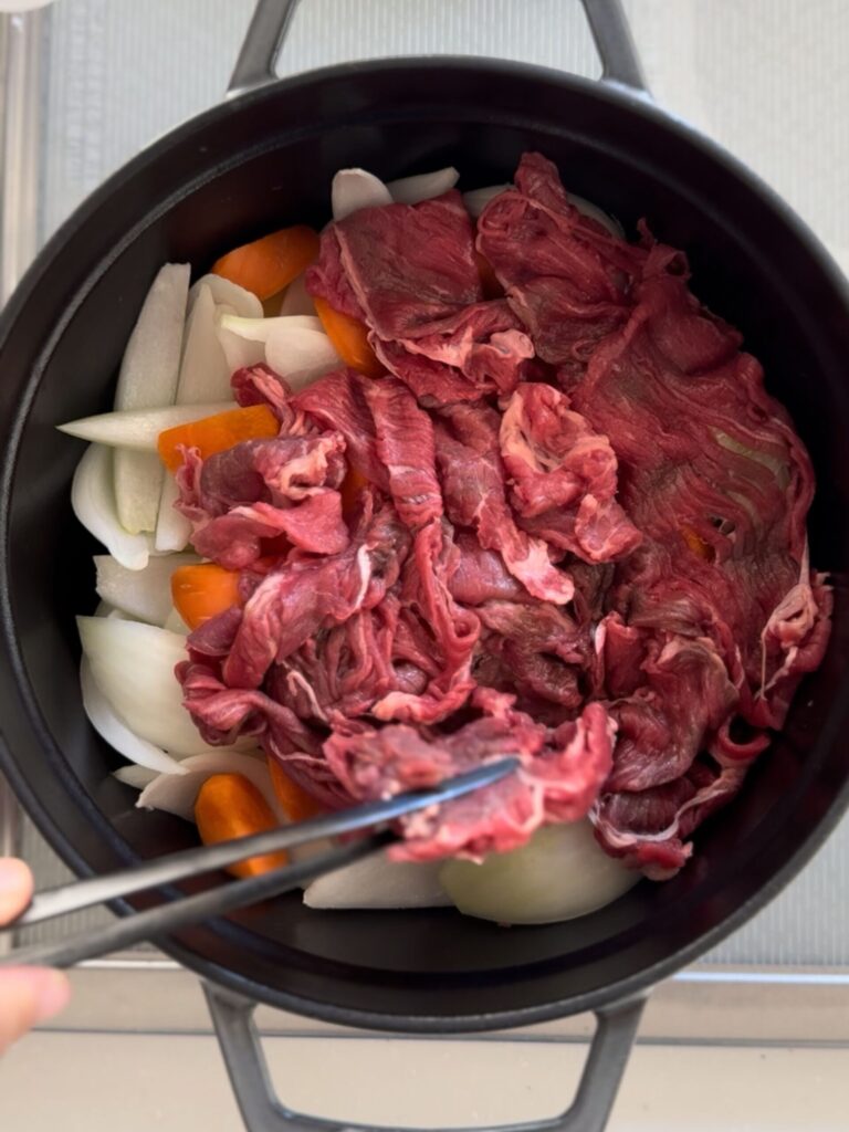 2.鍋に塩(ひとつまみ)→しらたき→じゃがいも→玉ねぎ→にんじん→牛肉の順に重ねる。