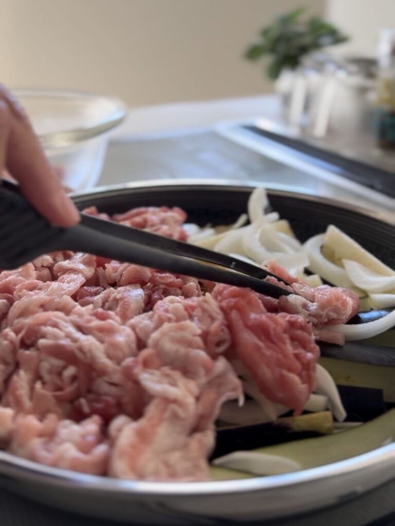 なすと豚バラのスタミナ重ね蒸しは、火にかけたら放っておくだけで完成する簡単レシピです。