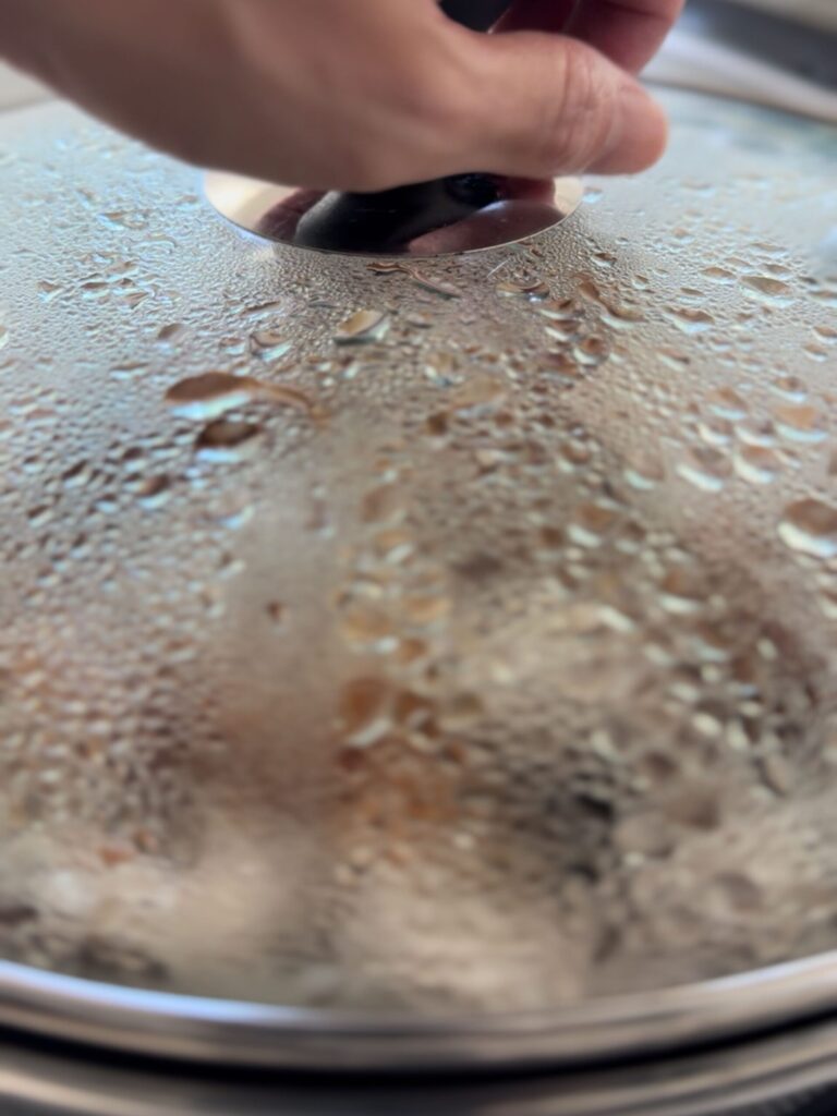 3.水を鍋肌からまわしかけ、ふたをして中火にかける。蒸気が上がったら火を弱めて7分蒸す。