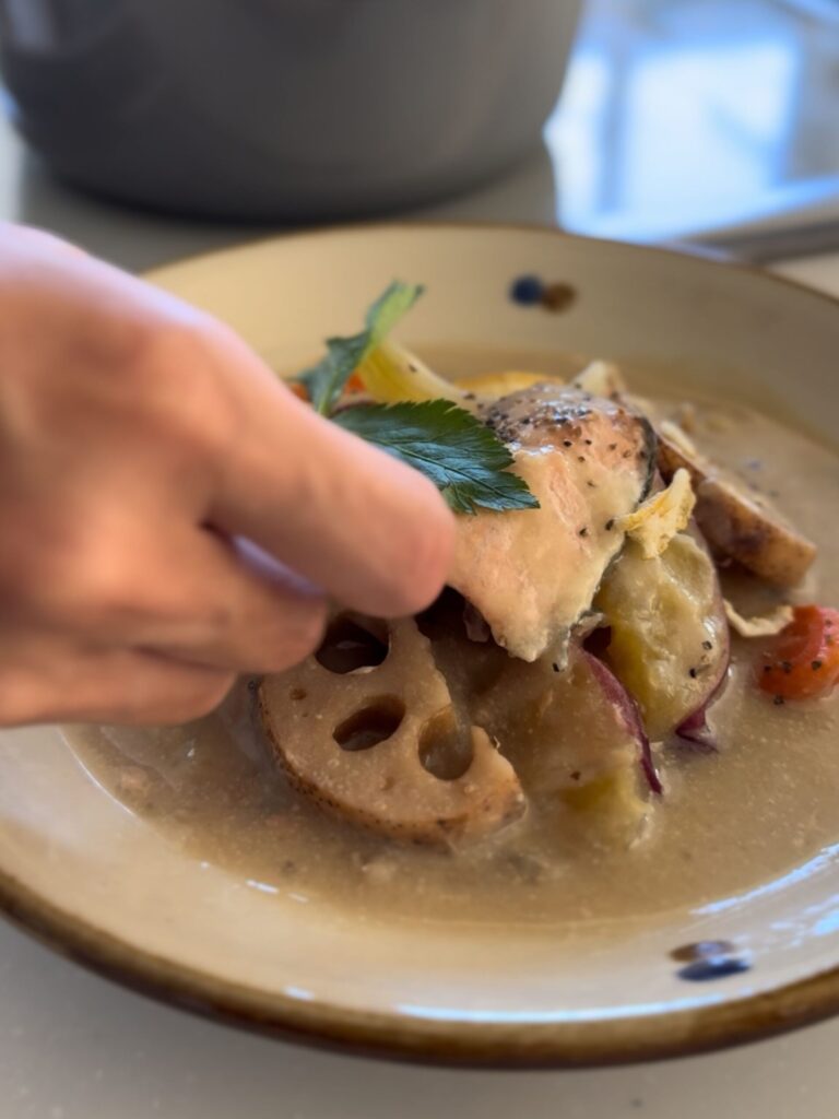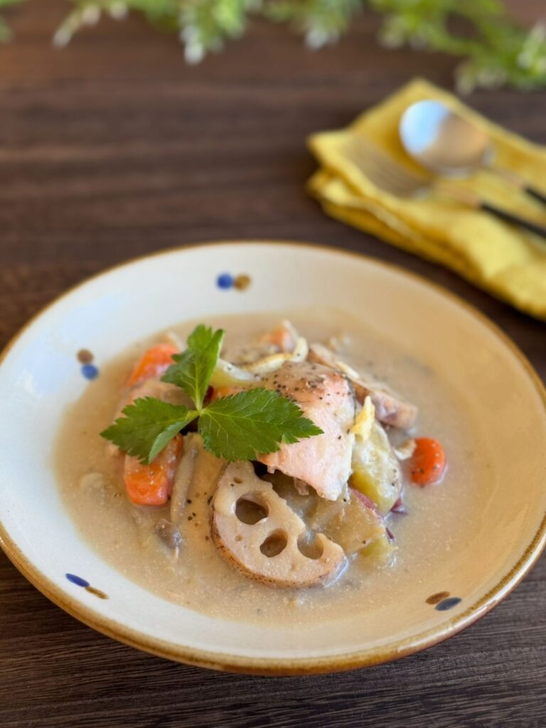 れんこんやさつまいもなどの根菜に、鮭のうまみが重なって、からだにしみわたる味わい。寒い季節にぴったりの、ほっこり温まる一皿です。