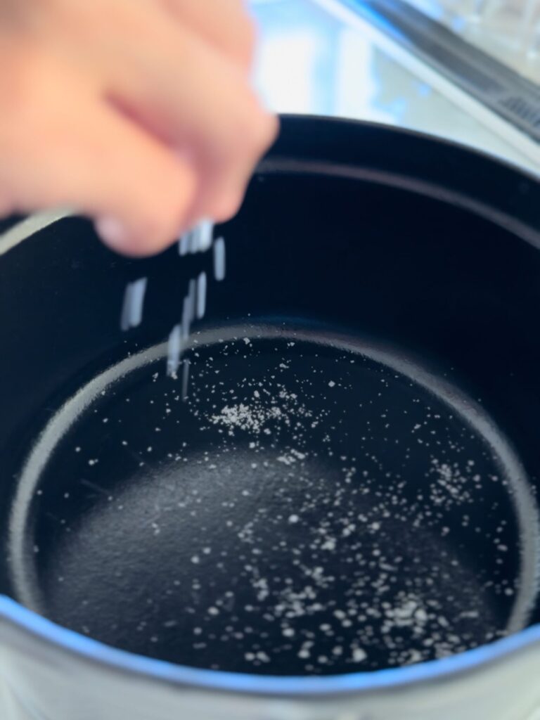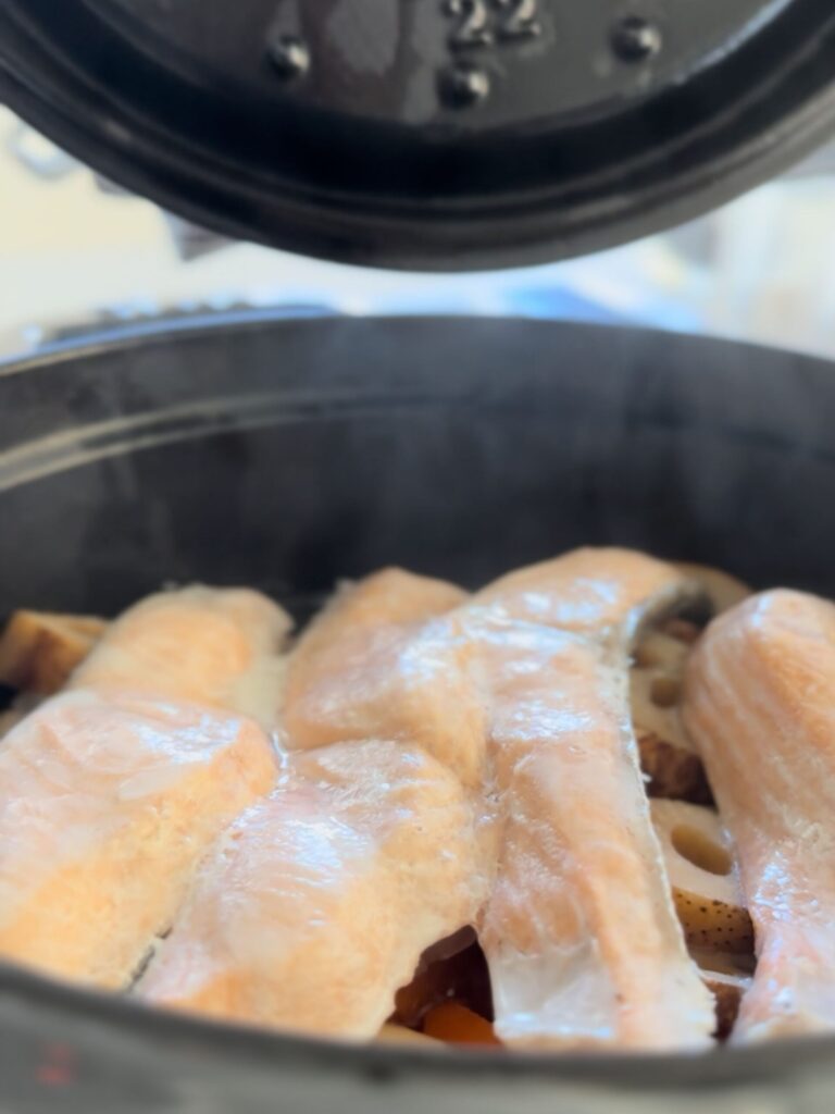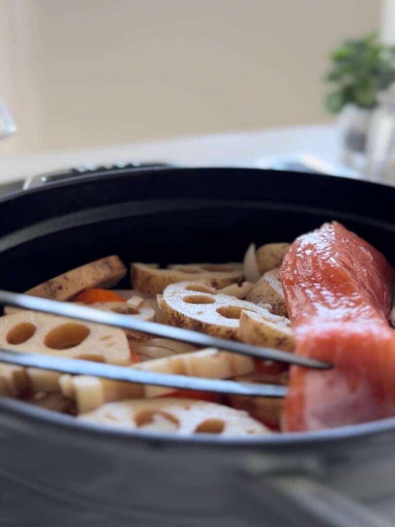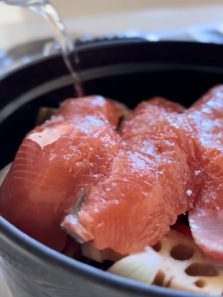 2.鍋に塩(ひとつまみ)→しめじ→さつまいも→玉ねぎ→にんじん→れんこん→鮭→塩(ひとつまみ)の順に重ねる。