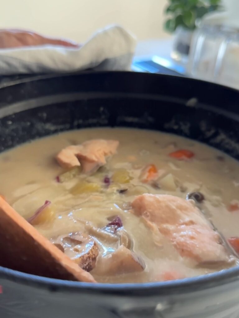 特にれんこんやさつまいもなどの根菜は、火を入れるとホクホクと甘みが増し、鮭のうまみと豆乳のまろやかさが相性抜群です。