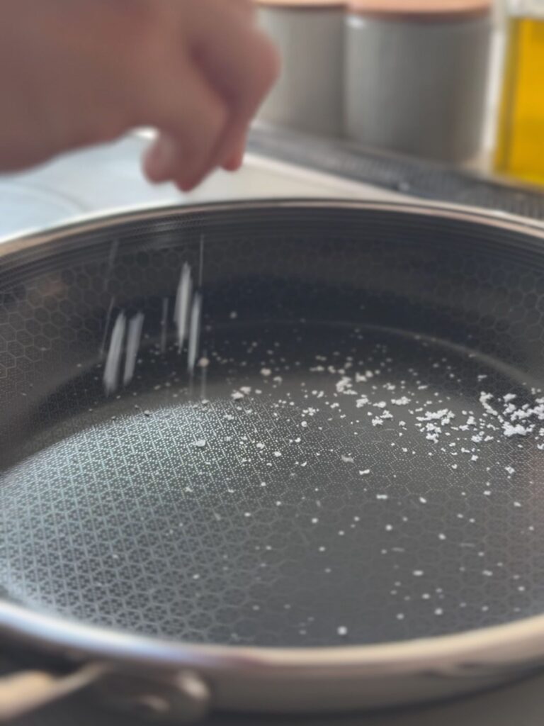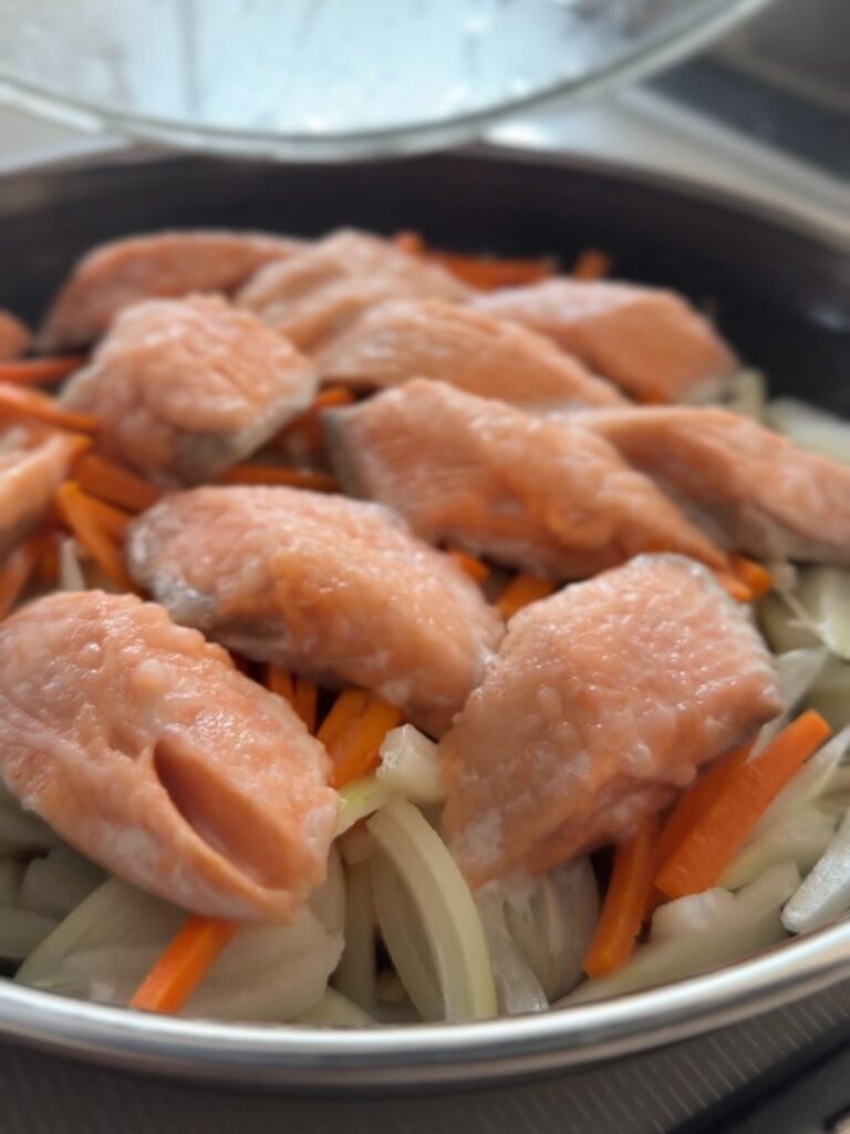 フライパンに、塩(ひとつまみ)→えのき→しいたけ→玉ねぎ→にんじん→鮭→塩(ひとつまみ)の順に重ねる。