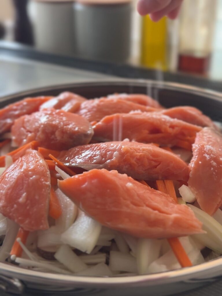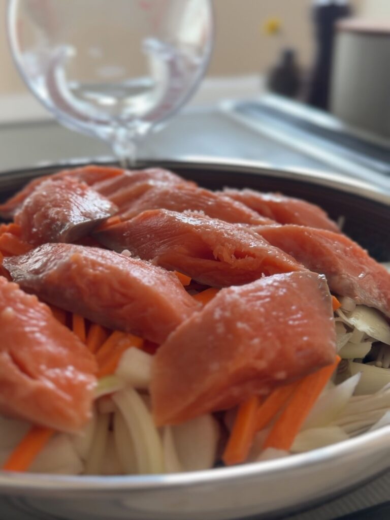 たっぷり野菜と鮭の和風マリネは、手間をかけずに栄養とおいしさを両立できる重ね蒸しレシピ。火にかけている間はほぼ放置できるので、忙しい日でも無理なく取り入れられます。