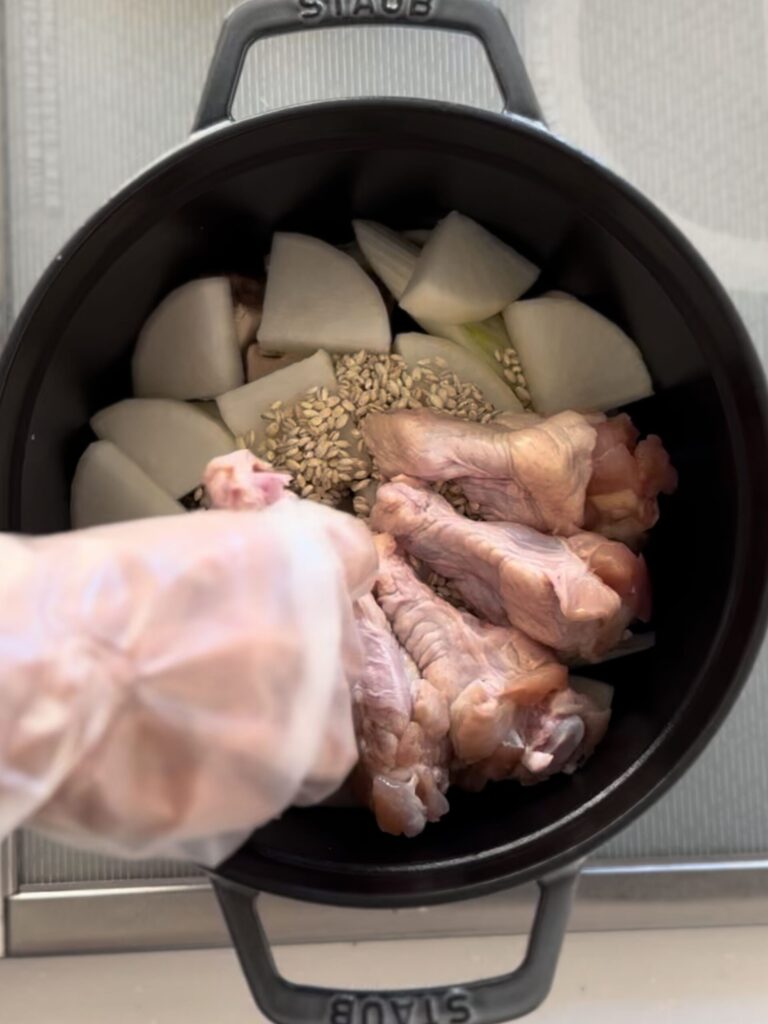 疲れた日や、家族の体を労わりたいときに。重ねて煮るだけの簡単サムゲタンで、あたたかい食卓を囲んでくださいね。