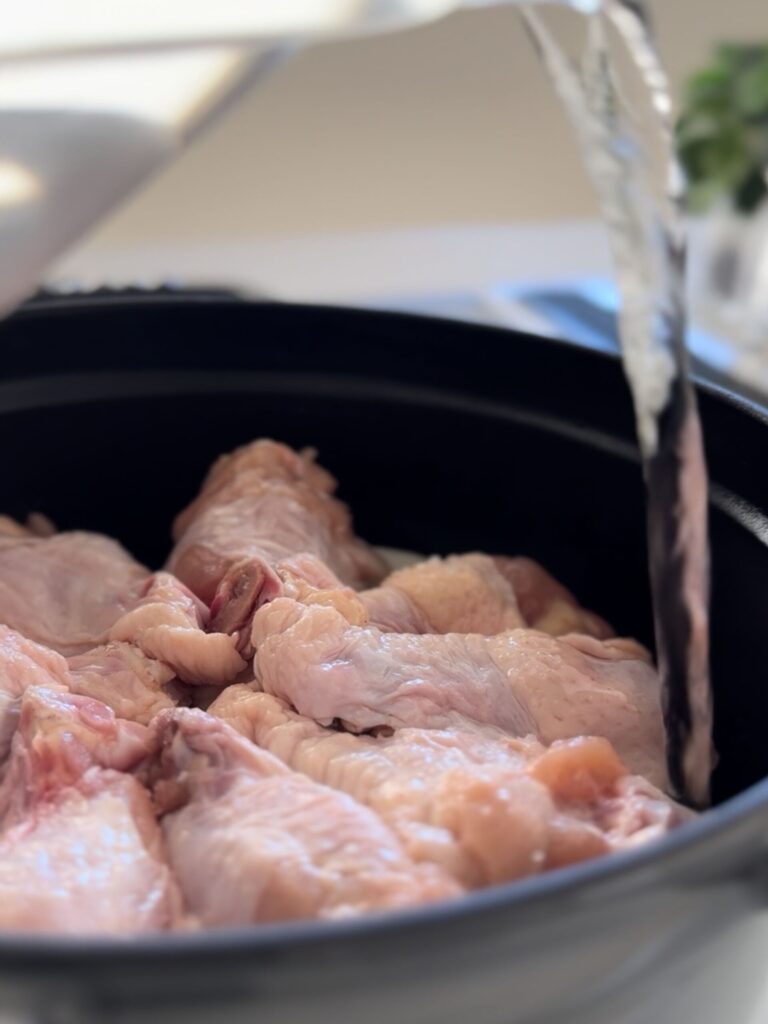 骨付きの手羽元を重ねて煮るだけ。