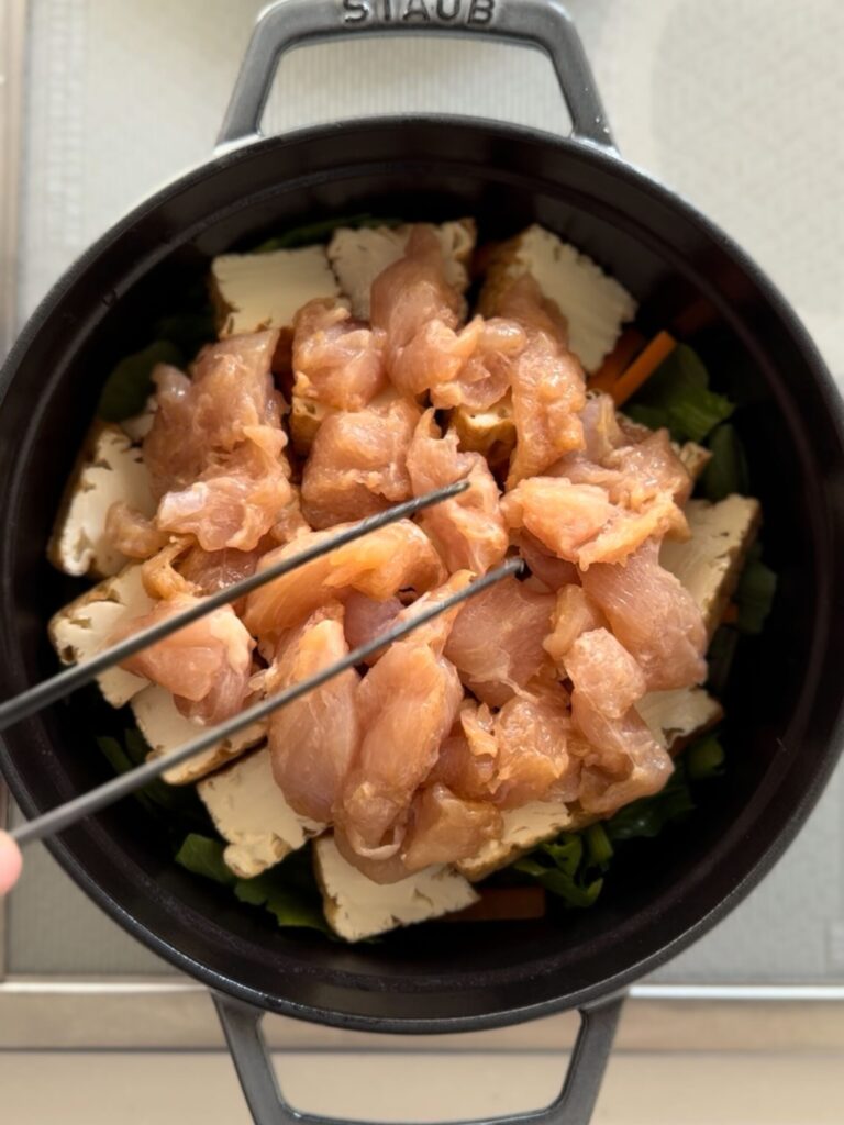 2.鍋に、塩(ひとつまみ)→しめじ→小松菜→にんじん→しょうが→厚揚げ→ささみ→塩(ひとつまみ)の順に重ねる。
