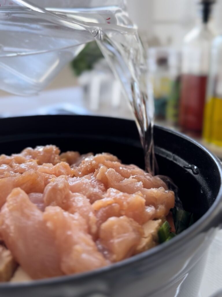 3.鍋肌からひたひたになるまで水を回しかけ(500mlほど)、ふたをして中火にかける。沸騰したら弱火にして10分煮る。