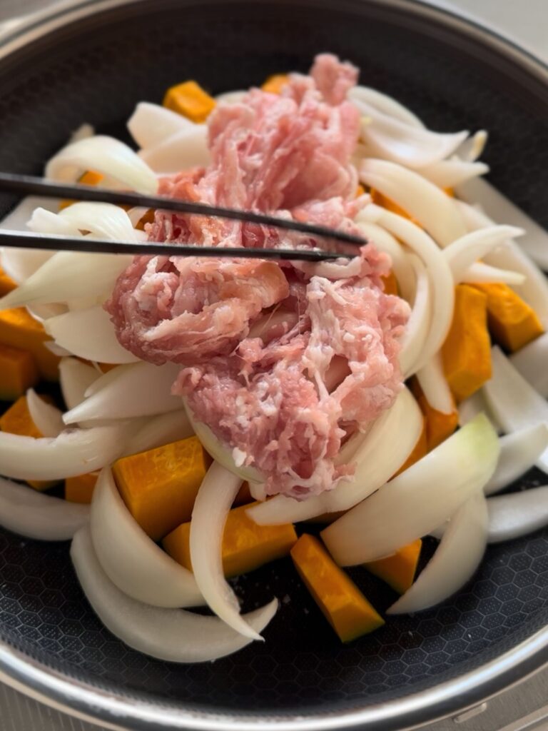 2.フライパンに塩(ひとつまみ)→かぼちゃ(皮を下に)→玉ねぎ→豚肉の順に重ねる。
