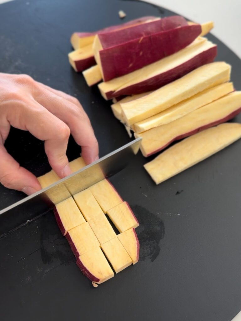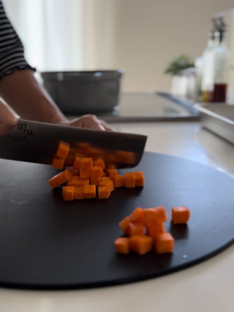 1.さつまいもは皮つきのまま1.5cm角に切る。玉ねぎは薄切り、にんじんは0.7~0.8cmのさいの目切りにする。