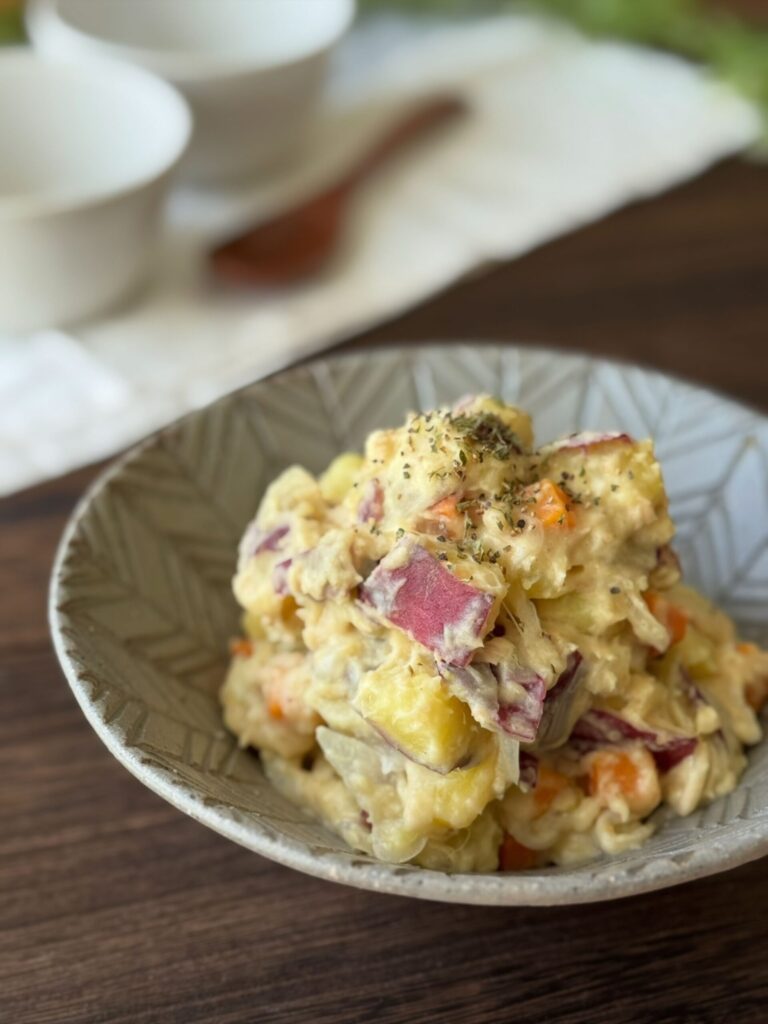 さつまいもの自然な甘みと、ツナマヨのコク、白ごまの香ばしさが絶妙にマッチするサラダです。