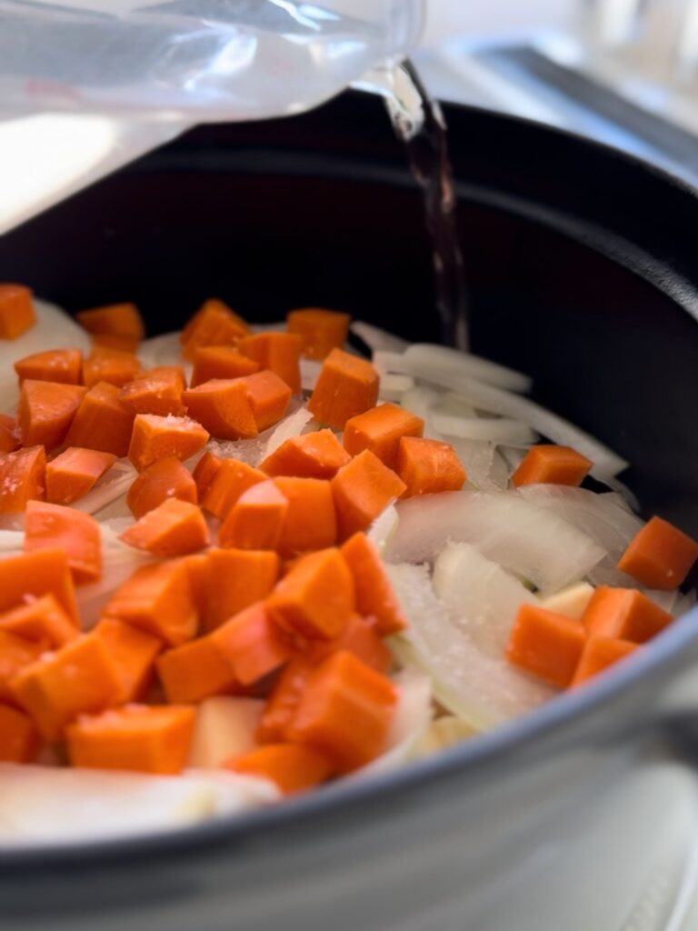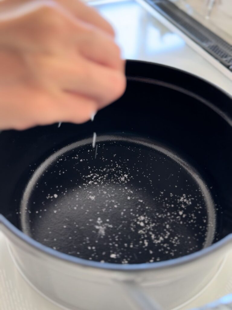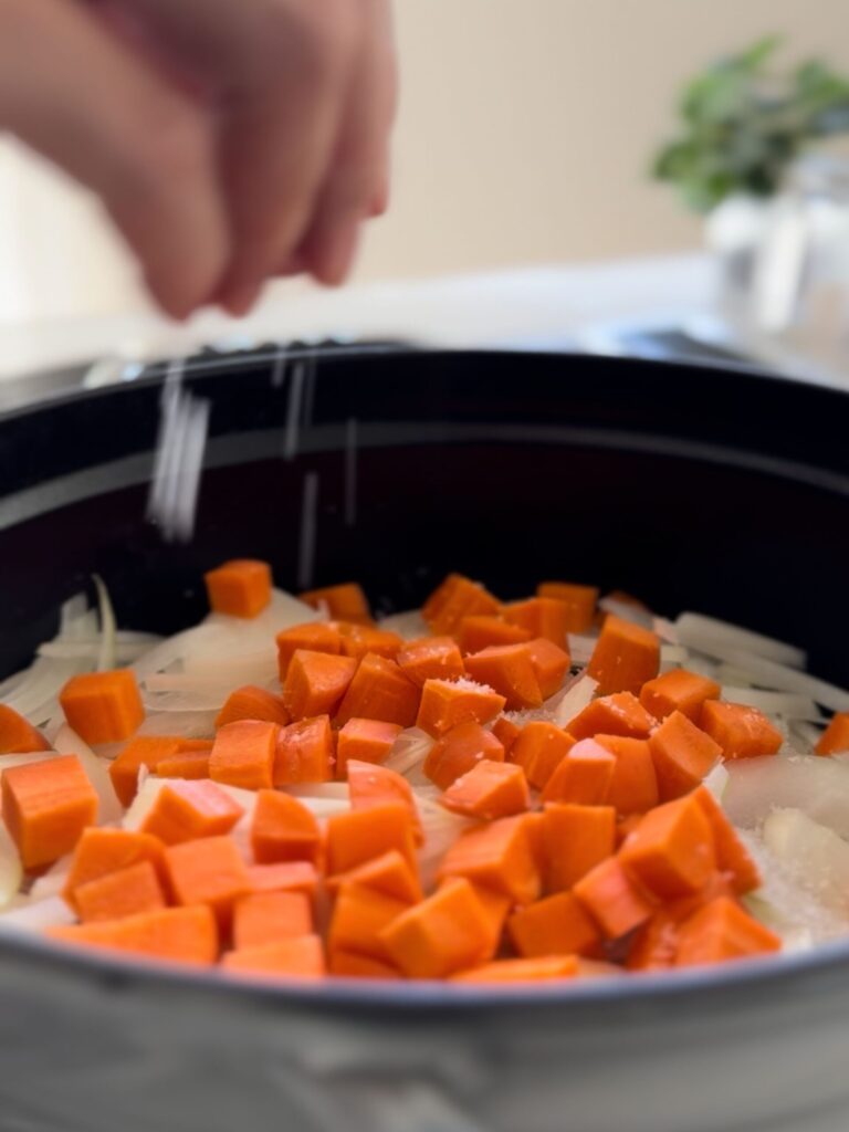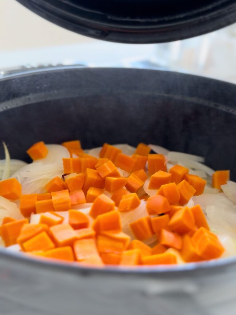 2.鍋に塩(ひとつまみ)→さつまいも→玉ねぎ→にんじん→塩(ひとつまみ)の順に重ねる。