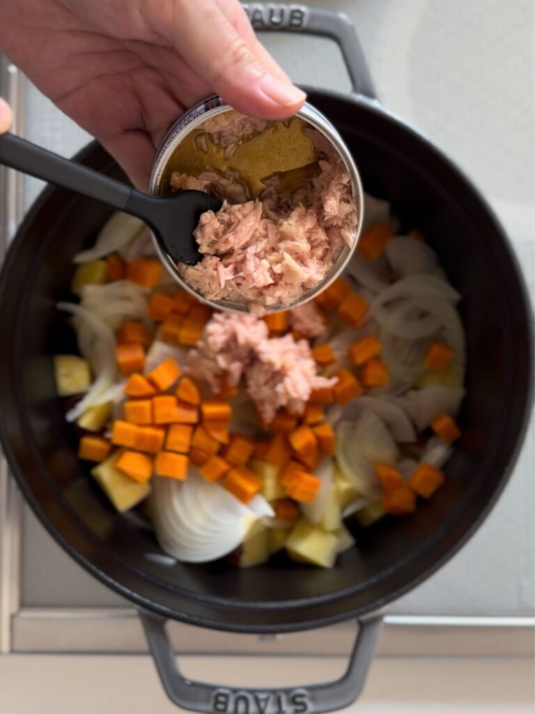 「重ね煮でつくるさつまいもツナマヨサラダ」は、忙しい日にほったらかしで作れる簡単副菜。