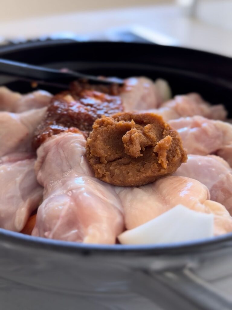 1.手羽元はポリ袋などで牛乳に30分ほど漬け込み、軽くすすぐ(臭みとり+やわらか仕上げ)。