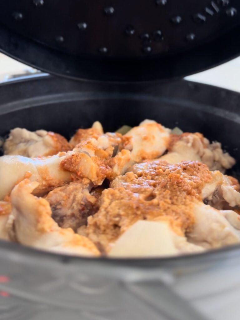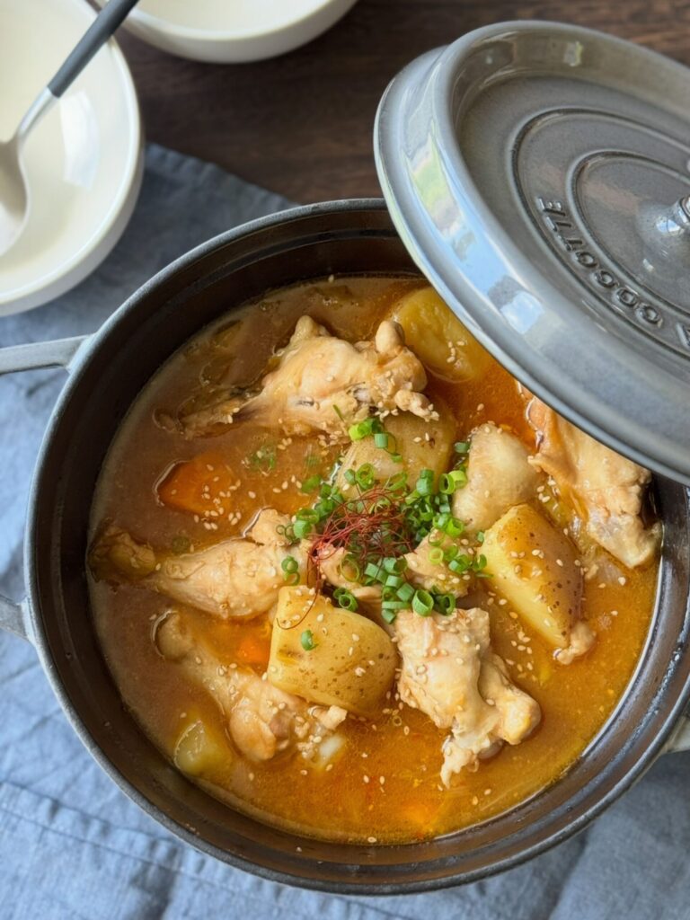 鶏と根菜を重ね煮で仕上げるタッポックムタンは、旨みが凝縮したスープとホロホロの手羽元が楽しめる韓国風煮込み料理。