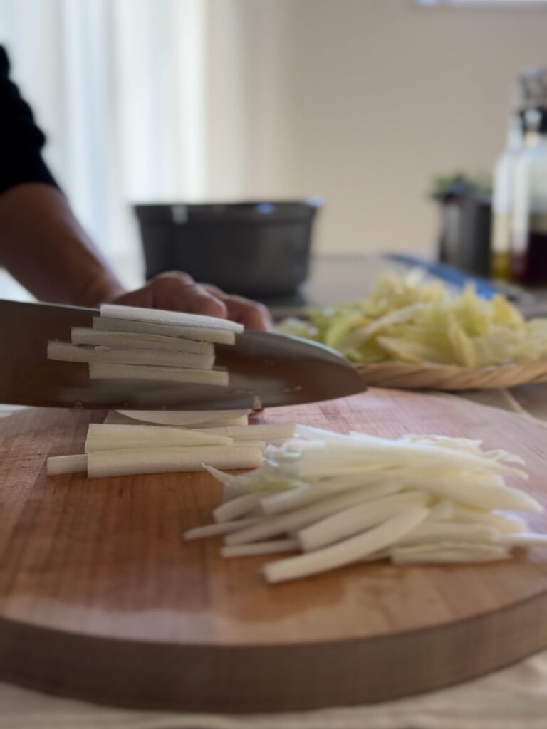 1.しめじは石づきを落としてほぐす。白菜は芯と葉を分けて、芯は細切り、葉はざく切りにする。にんじんは千切りにする。