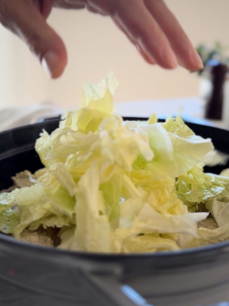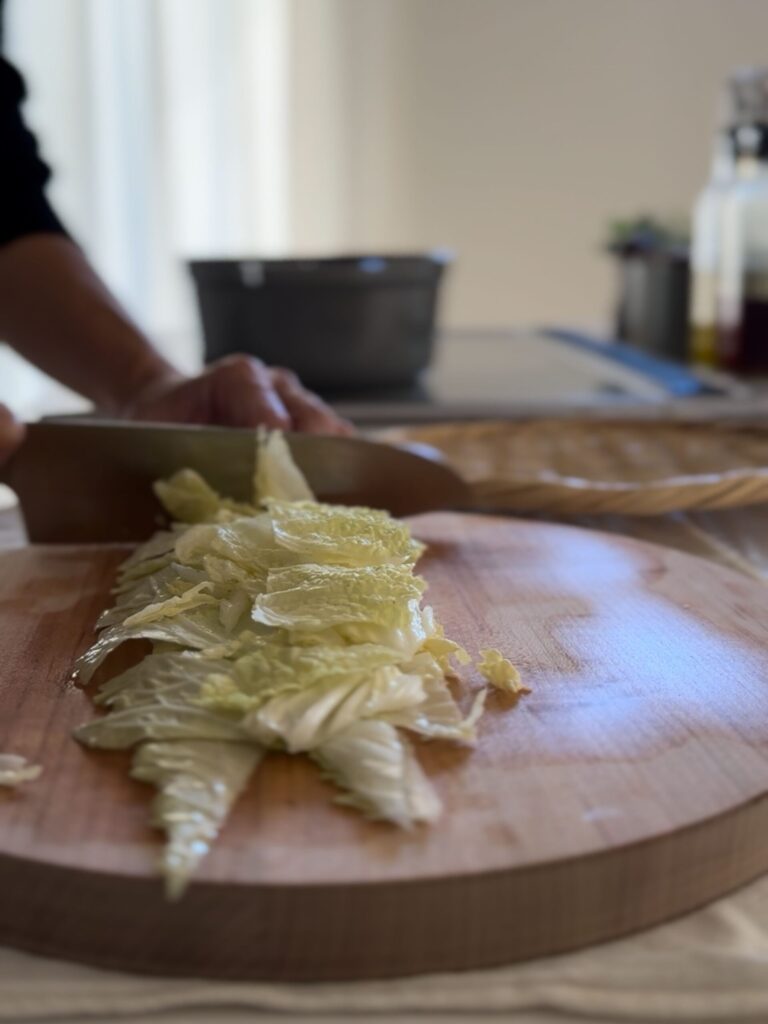 5.白菜(葉)加えて、豆乳を少しずつ注ぎながら沸騰しないように加熱する。味をみて塩で調え、お好みでごま油をまわしかける。器に盛り、粗びき黒こしょう・小ねぎを振る。