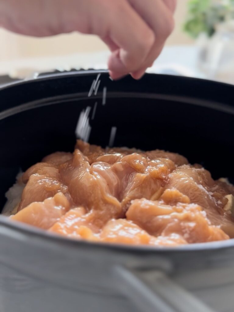 2.鍋に塩(ひとつまみ)→しいたけ→しょうが→長ねぎ(白い部分)→大根→油揚げ→鶏むね肉→塩(ひとつまみ)の順に重ねる。