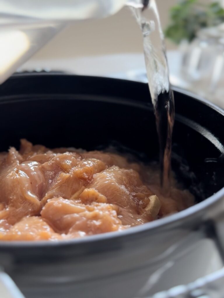 • 鶏むね肉がしっとりやわらか。片栗粉でうまみを閉じ込める