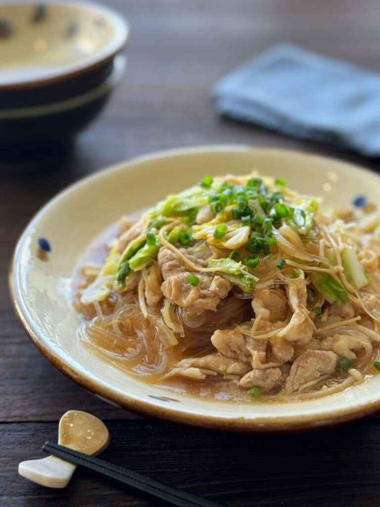 豚肉のうまみと白菜の甘みが重なり、春雨がそのおいしさをしっかりと吸い込んだ、とろりとやさしい一皿。