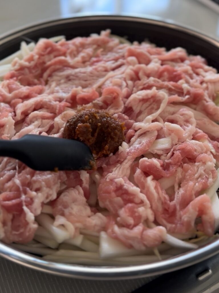 2.フライパンに、塩(ひとつまみ)→えのき→緑豆春雨→白菜(芯)→豚肉→みその順に重ねる。