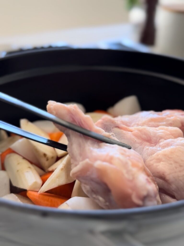 2.鍋に下から塩(ひとつまみ)→しいたけ→長ねぎ(白い部分)→大根→にんじん→ごぼう→手羽元→みその順に重ねる。