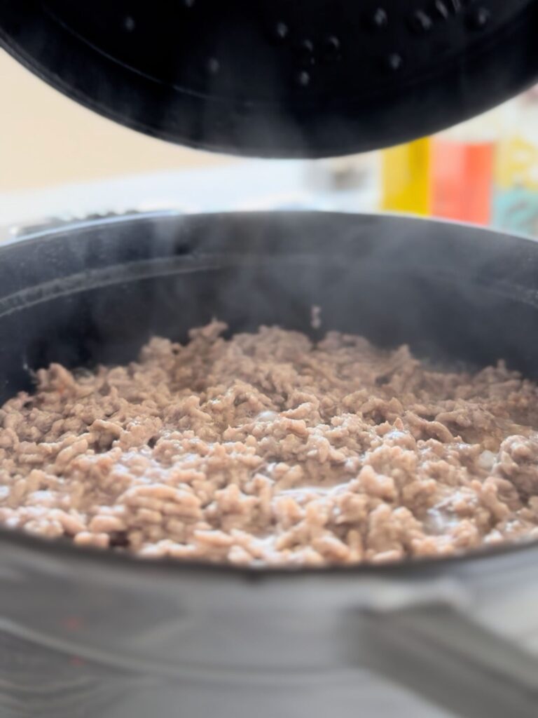2.フライパンに塩ひとつまみをふり、トマト→なす→オクラ→玉ねぎ→にんにく・しょうが→合いびき肉の順に重ねる。