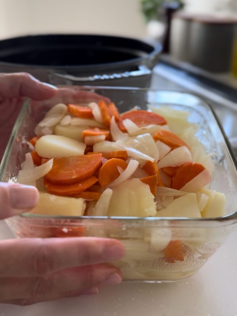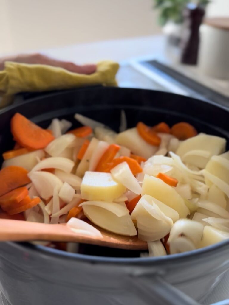 野菜を重ねて蒸し煮にするだけで、下ごしらえとベース作りが完了。